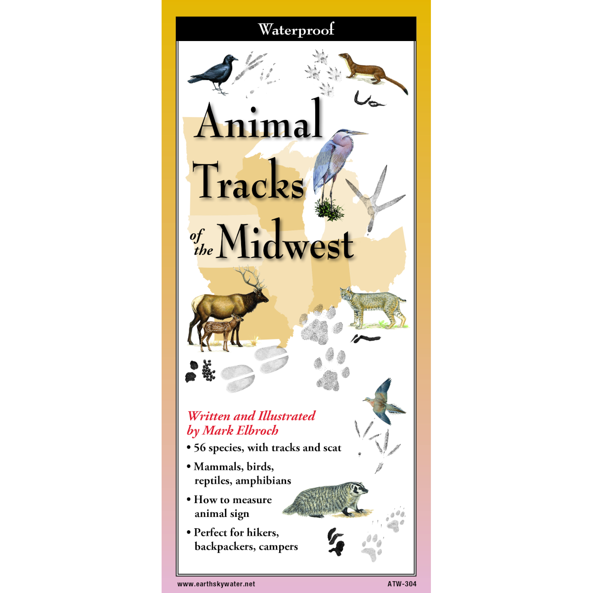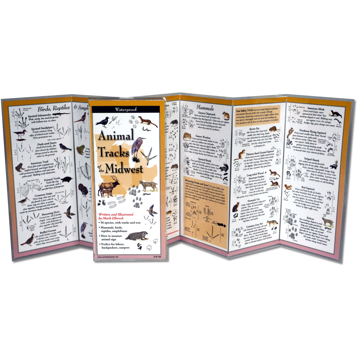 This handy FoldingGuide™ includes 56 species of mammals, reptiles, and birds whose tracks and scat are most commonly found. Each entry includes a thumbnail illustration of the animal, detailed track and scat illustrations with precise size dimensions, and a caption and call-outs to help point out the fine details necessary to make accurate identifications.